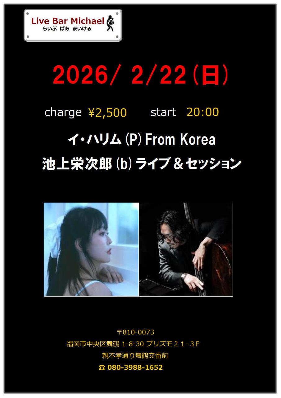 | 出演者 | イ・ハリム(P)From Korea 池上栄次郎(b)ライブ&セッション2500円20:00スタート |