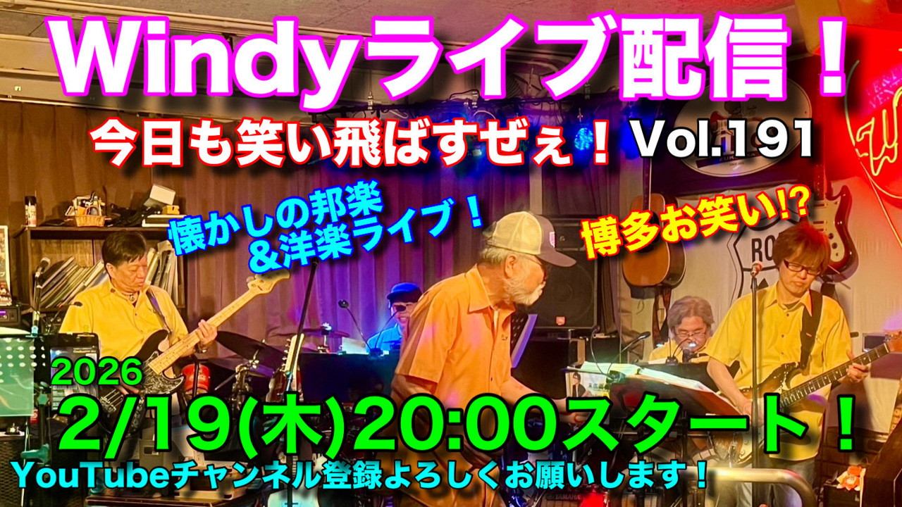 | イベントホームページ | ◎ライブ配信詳細↓ ◆Windyライブ生配信!今日も笑い飛ばすぜぇ!Vol.191 2月19日(木) スタート:20:00~ https://youtube.com/live/okZCos5PT6g ※ポチっと押すだけのYouTube【チャンネル登録】よろしくお願いします! ◎投げ銭(Windyを応援する券)も受け付けております。 配信継続のためのご支援ご検討いただけると幸いです。 https://passmarket.yahoo.co.jp/event/show/detail/01b7matmh8z41.html 【投げ銭はWebとは別に直接お振込でも受け付けております。投げ銭の御礼特典もございますので、詳細を上記URL内イベント情報をご覧ください】 |