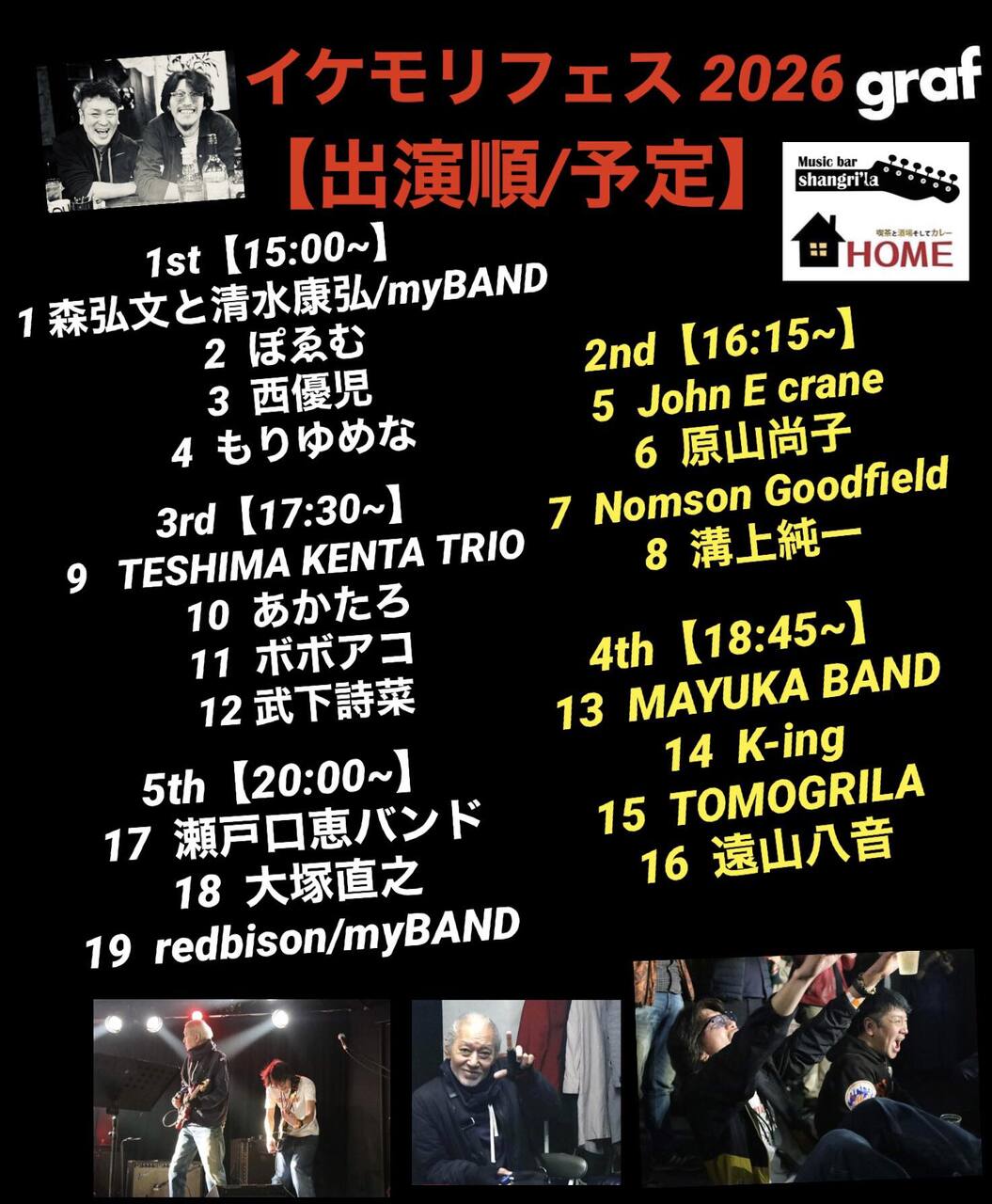 | 出演者 | 森弘文と清水康弘/myBAND ぽゑむ 西優児 もりゆめな John E crane 原山尚子 Nomson Goodfield 溝上純一 TESHIMA KENTA TRIO あかたろ ボボアコ 武下詩菜 MAYUKA BAND K-ing TOMOGRILA 遠山八音 瀬戸口恵バンド 大塚直之 redbison/myBAND |