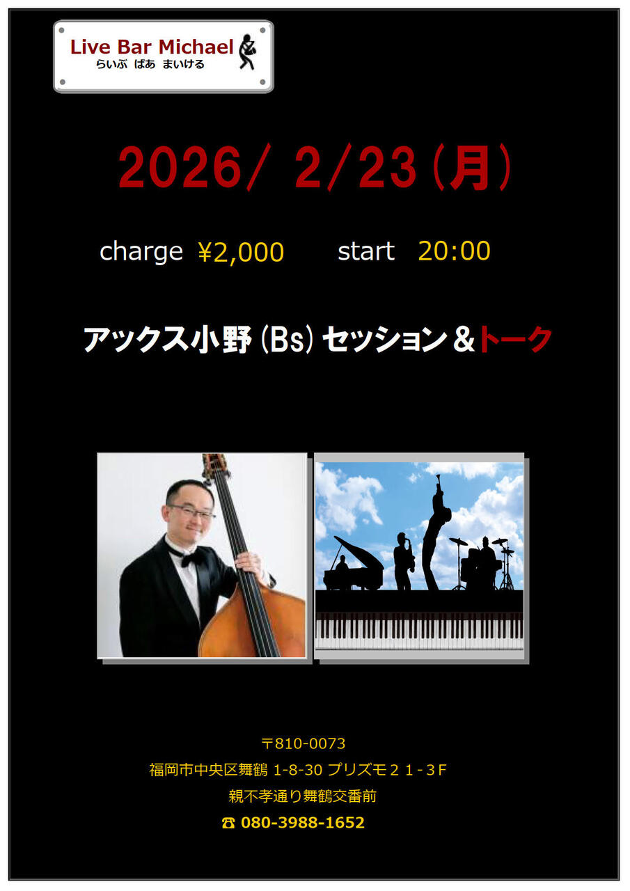 - 出 演 : アックス小野(Bs)セッション&トーク2000円20:00スタート
