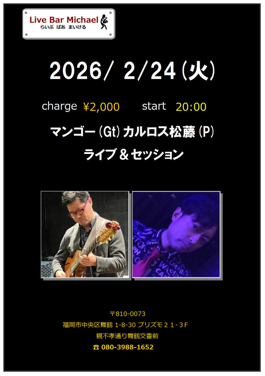 マンゴー(Gt)カルロス松藤(P)ライブ&セッション2000円20:00スタート