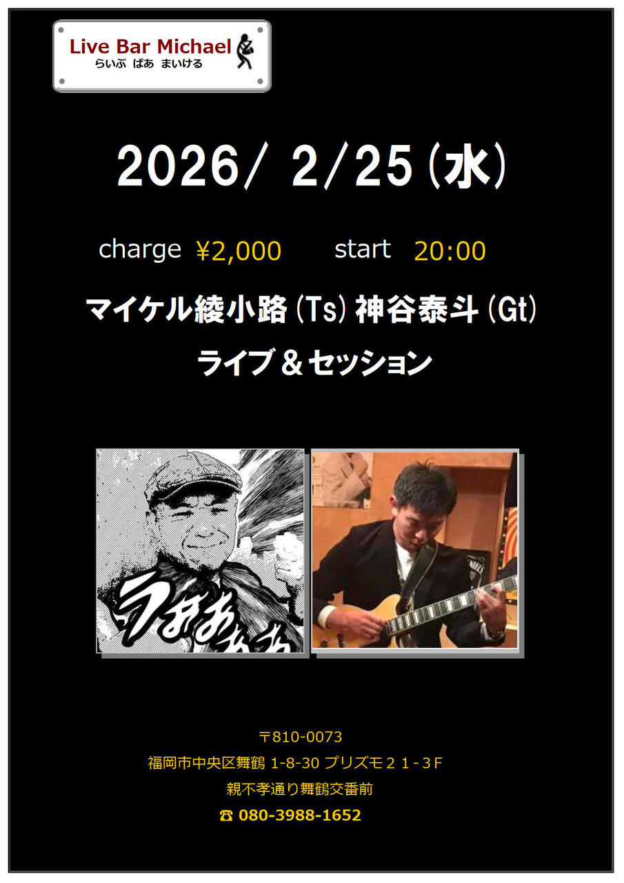 | 出演者 | マイケル綾小路(Ts)神谷泰斗(Gtライブ&セッション2000円20:00スタート |