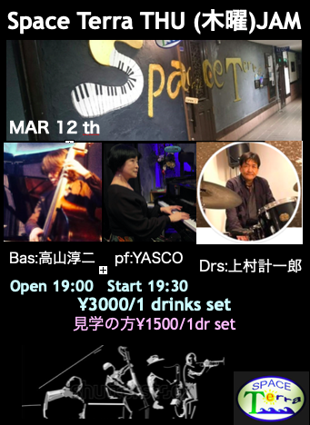 | 出演者 | Bass:高山淳二 Drums上村計一郎: Piano:YASCO |