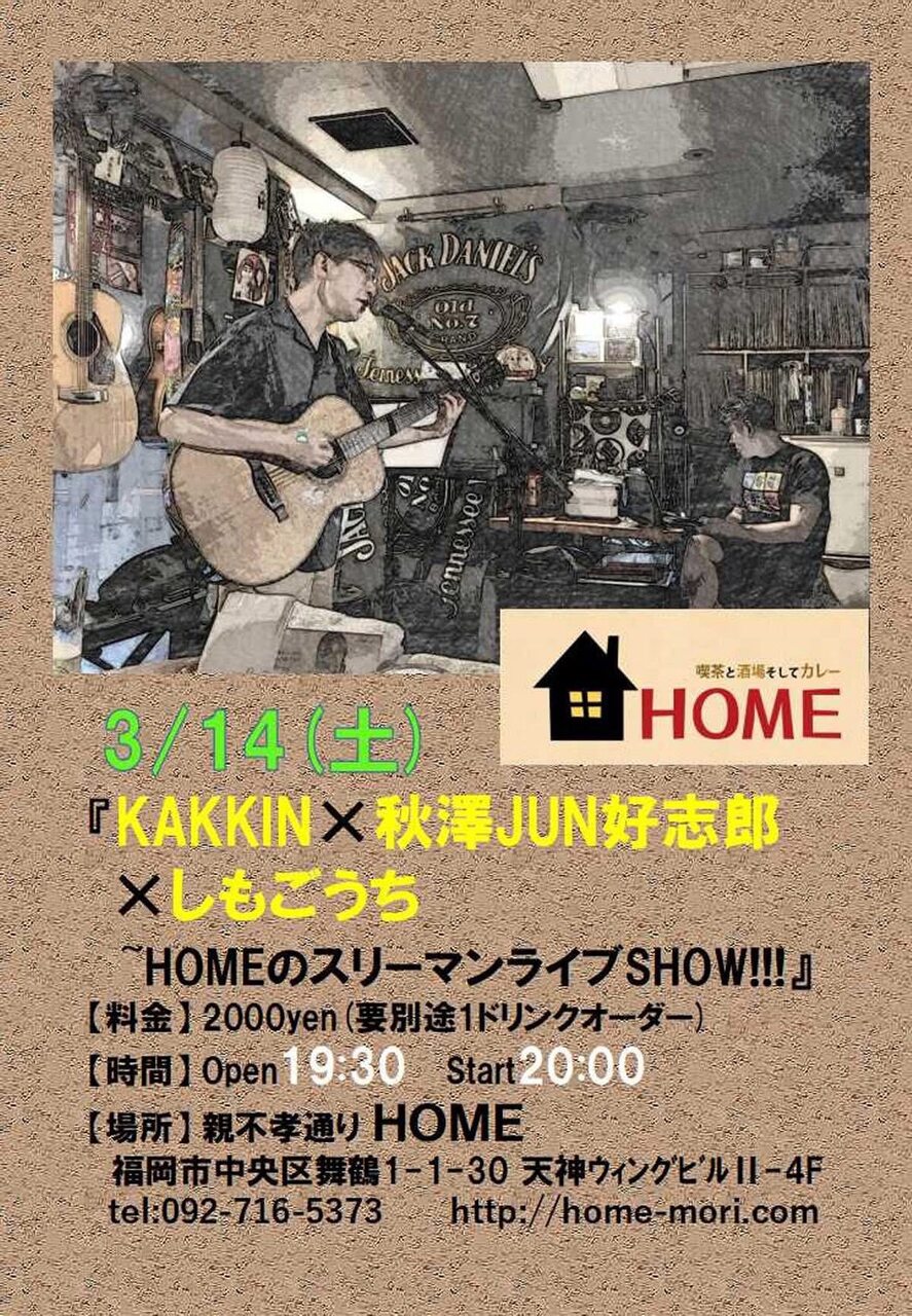 | イベント名 | KAKKIN ×しもごうち×秋澤JUN好志郎~HOMEのスリーマンライブSHOW!!! |