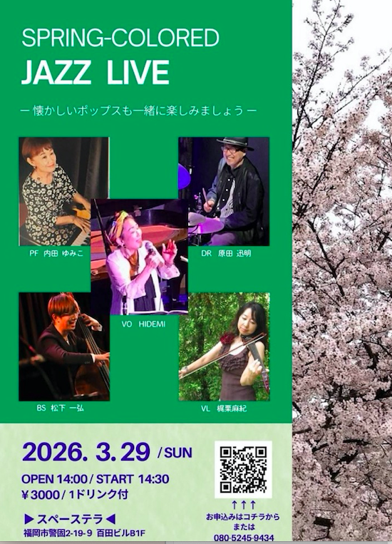 | 出演者 | Vo:Hidemi Vi:梶栗麻紀 pf:内田ゆみこ Drs:松下一弘 Ds:原田迅明 |