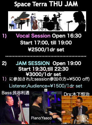 | 出演者 | Bass:民谷利通、Drums:木下恒治 pf:YASCO |