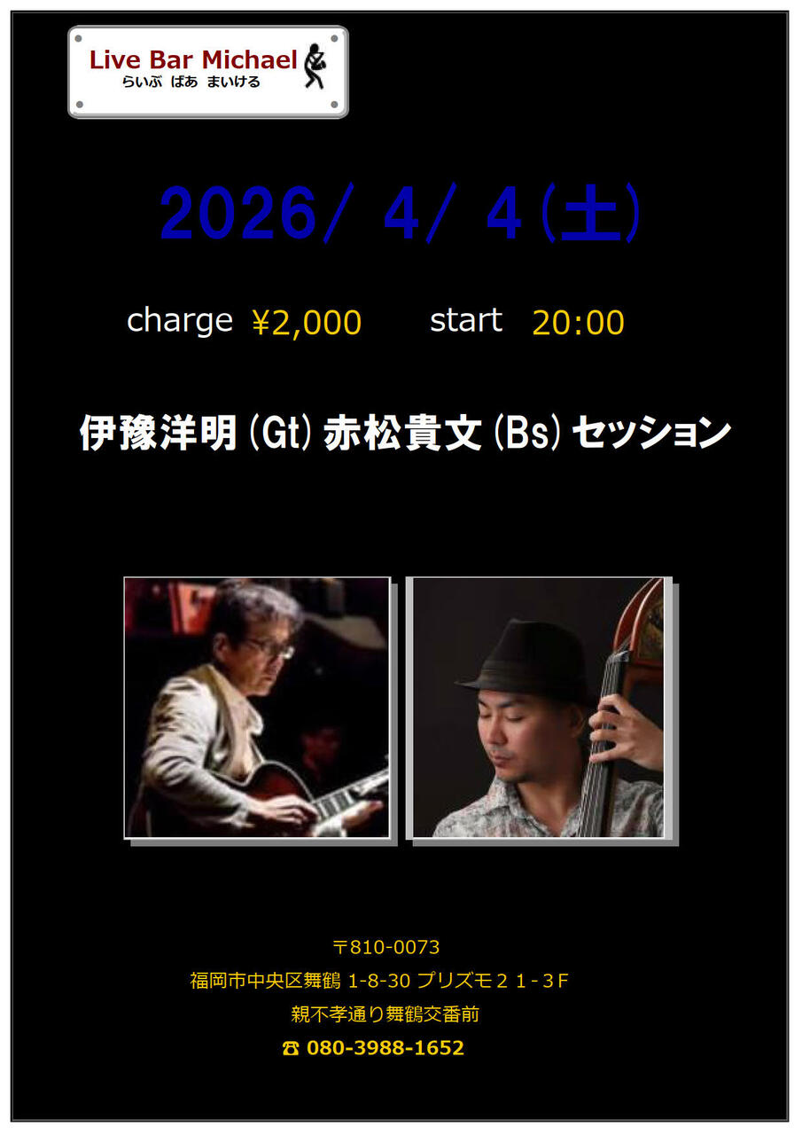 - 出 演 : 伊豫洋明(Gt)赤松貴文(Bs)セッション2000円20:00スタート