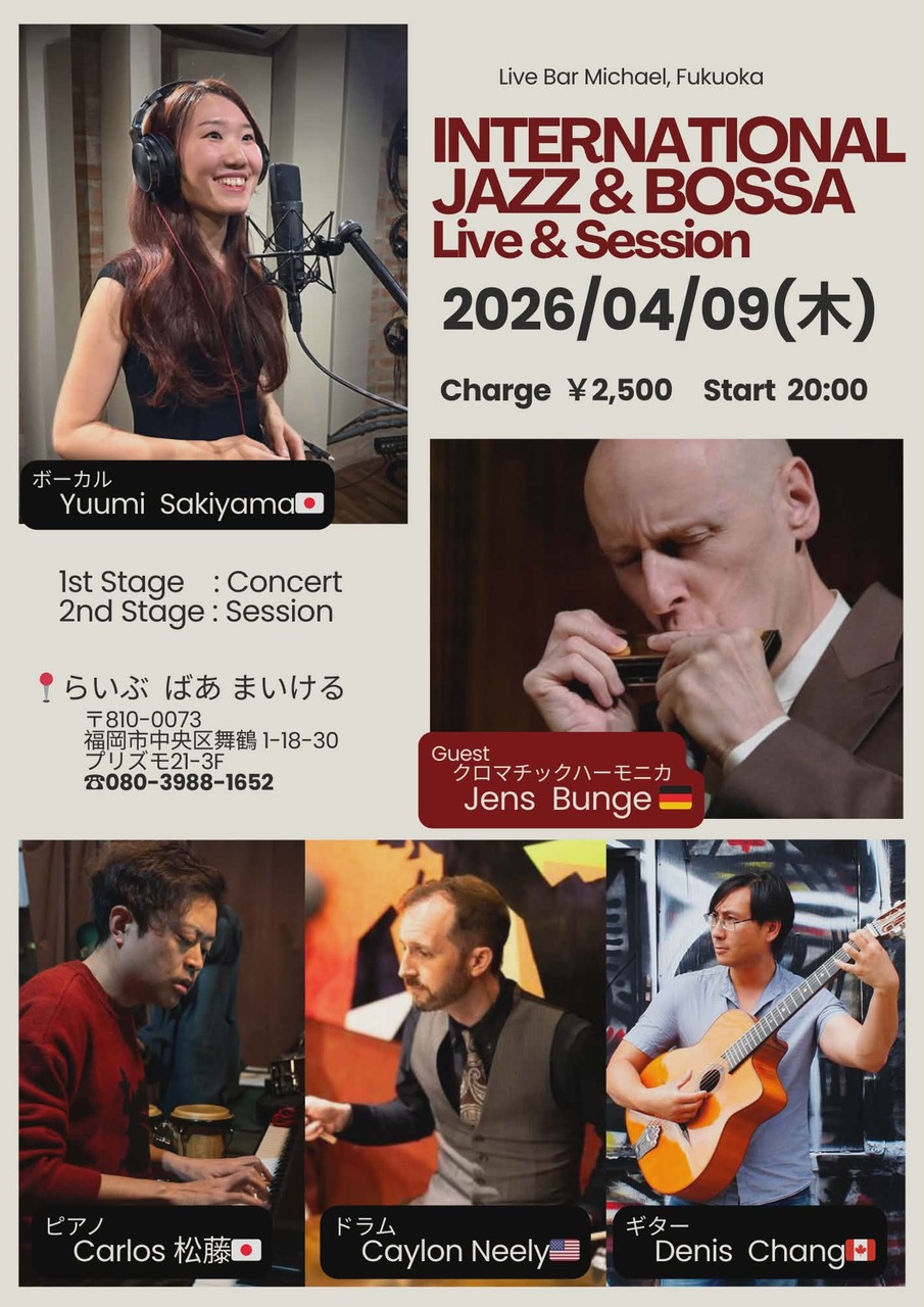 - 出 演 : Yuumi(Vo)Jens Bunge(Hr)Denis Chang(Gt)カルロス松藤(P)Caylon Neely(Dr)ライブ&セッション2500円20:00スタート