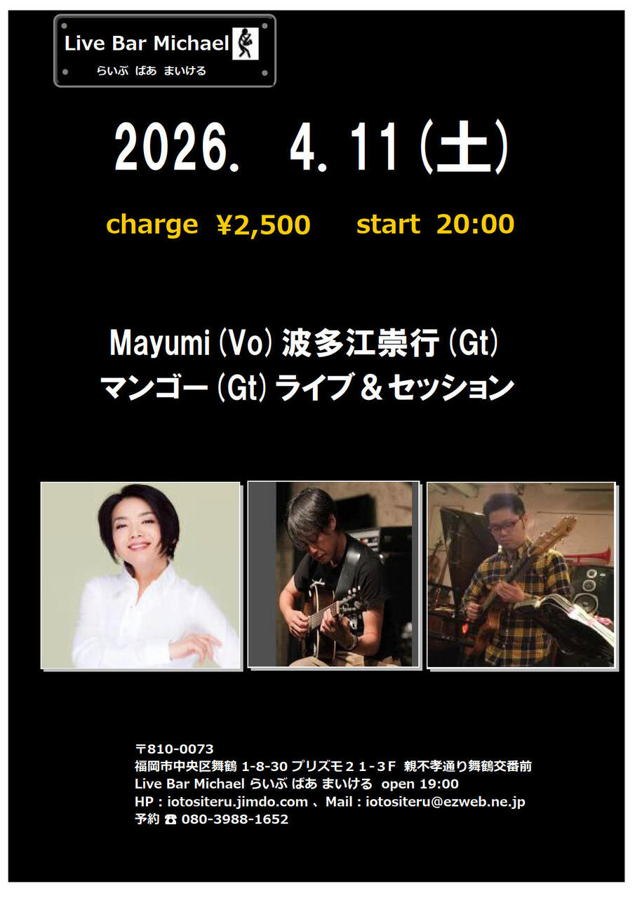 | 出演者 | Mayumi(Vo)波多江崇行(Gt)マンゴー(Gt)ライブ&セッション2500円20:00スタート |