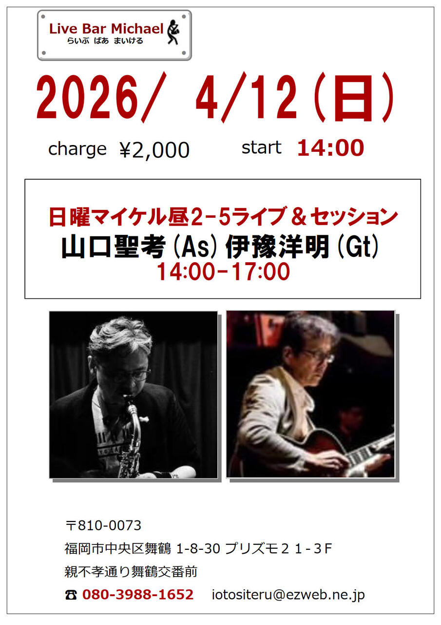 日曜マイケル昼2-5ライブ&セッション山口聖考(As)伊豫洋明(Gt)2000円14:00~17:00