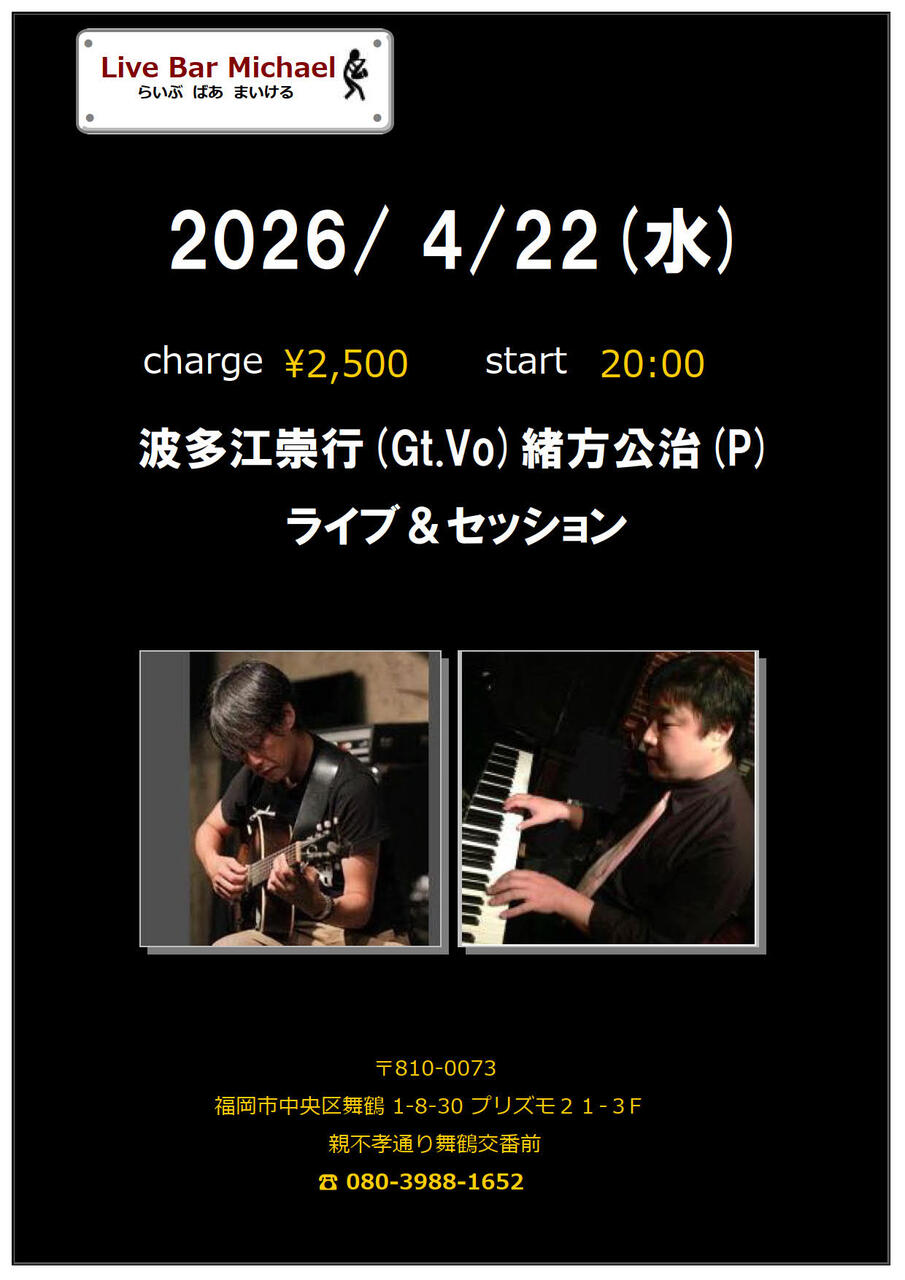 波多江崇行(Gt.Vo)緒方公治(P)2500円20:00スタート