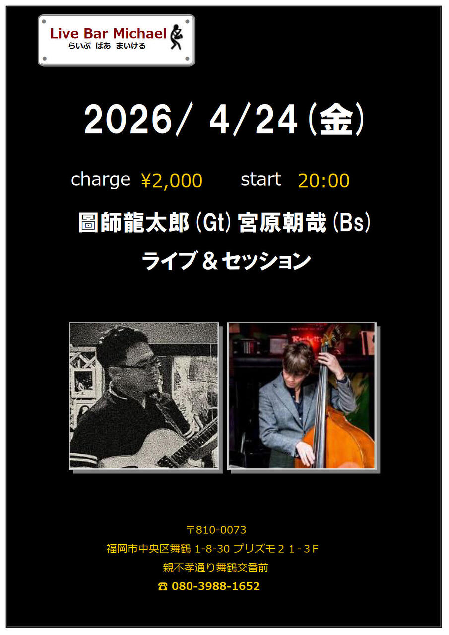 - 出 演 : 圖師龍太郎(Gt)宮原朝哉(Bs)セッション2000円20:00スタート