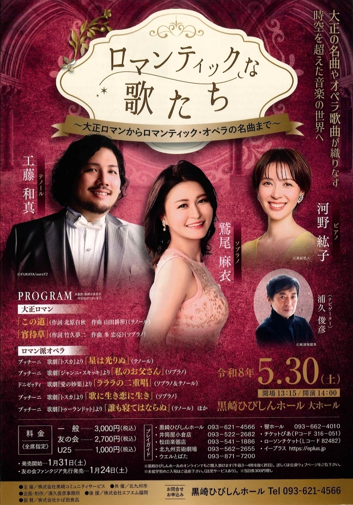 - 出 演 : テノール:工藤和真、ソプラノ:鷲尾麻衣、ピアノ:河野紘子、ナビゲーター:浦久俊彦