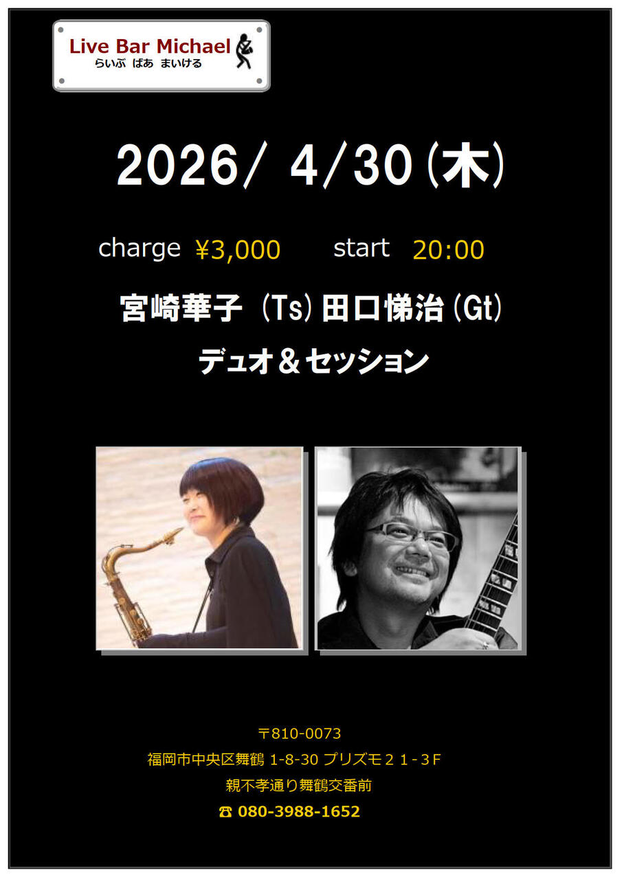 - 出 演 : 宮崎華子(Ts)田口悌治(Gt)ライブ3000円20:00スタート
