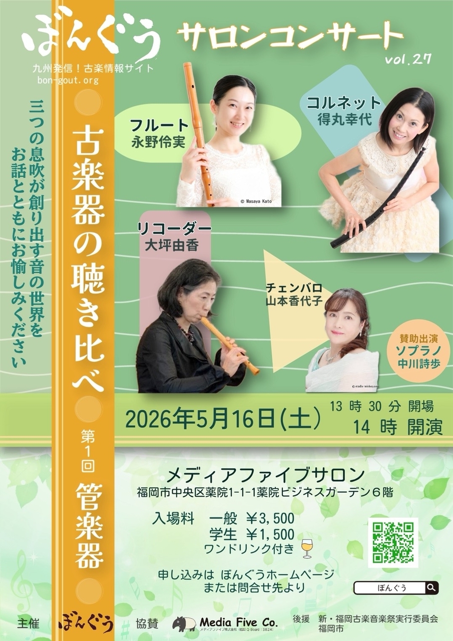 | 出演者 | フルート:永野伶実、コルネット:得丸幸代、リコーダー:大坪由香、チェンバロ:山本香代子、賛助出演ソプラノ:中川詩歩 |