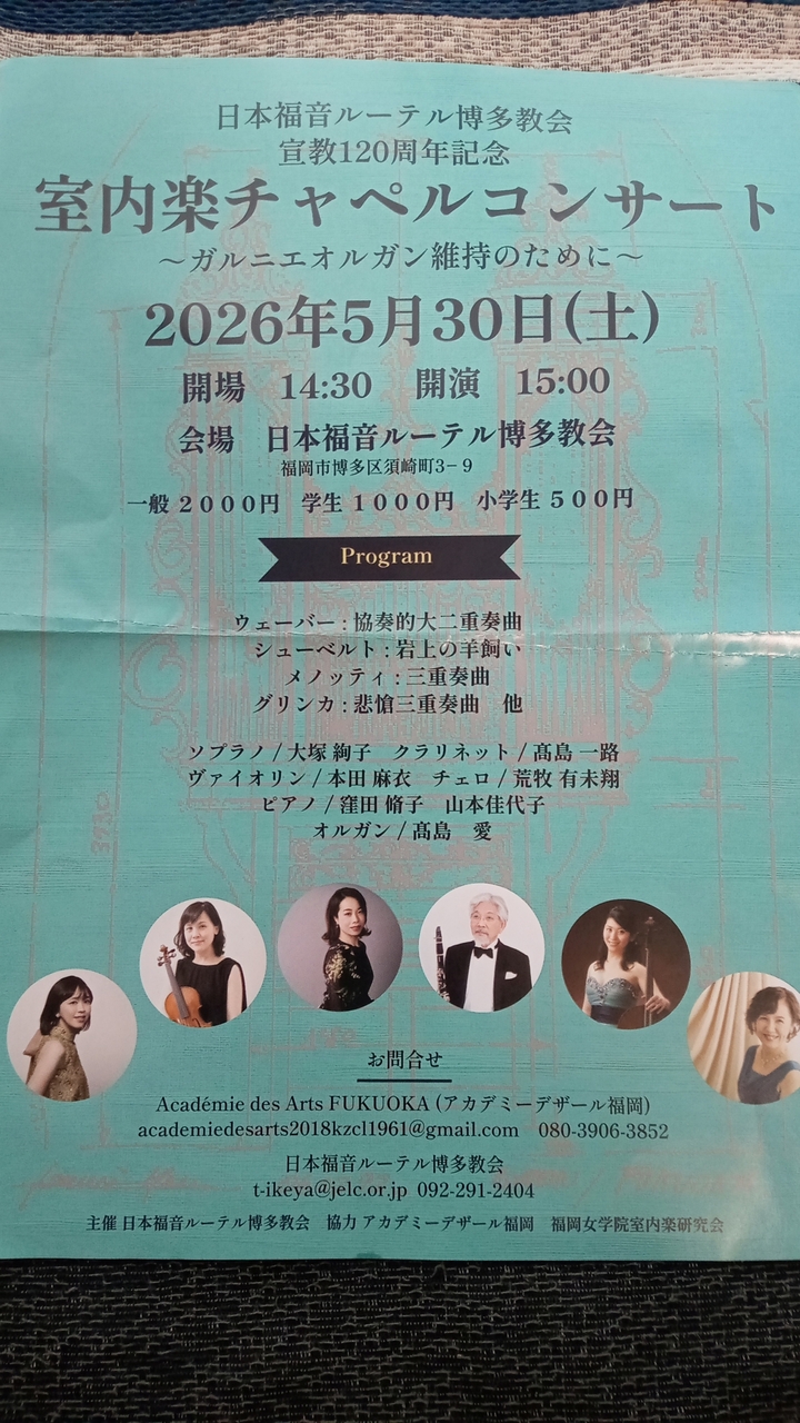 | イベント名 | 日本福音ルーテル博多教会 宣教120周年記念 室内楽チャペルコンサート |