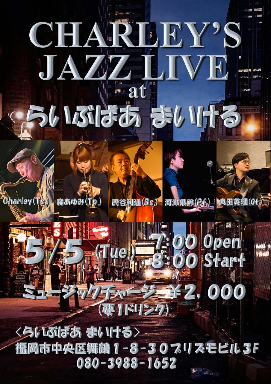 | 出演者 | チャーリー見寺(Ts)奥田英理(Gt)森あゆみ(Tp)民谷利通(Bs)ライブ&セッション2000円20:00スタート |
