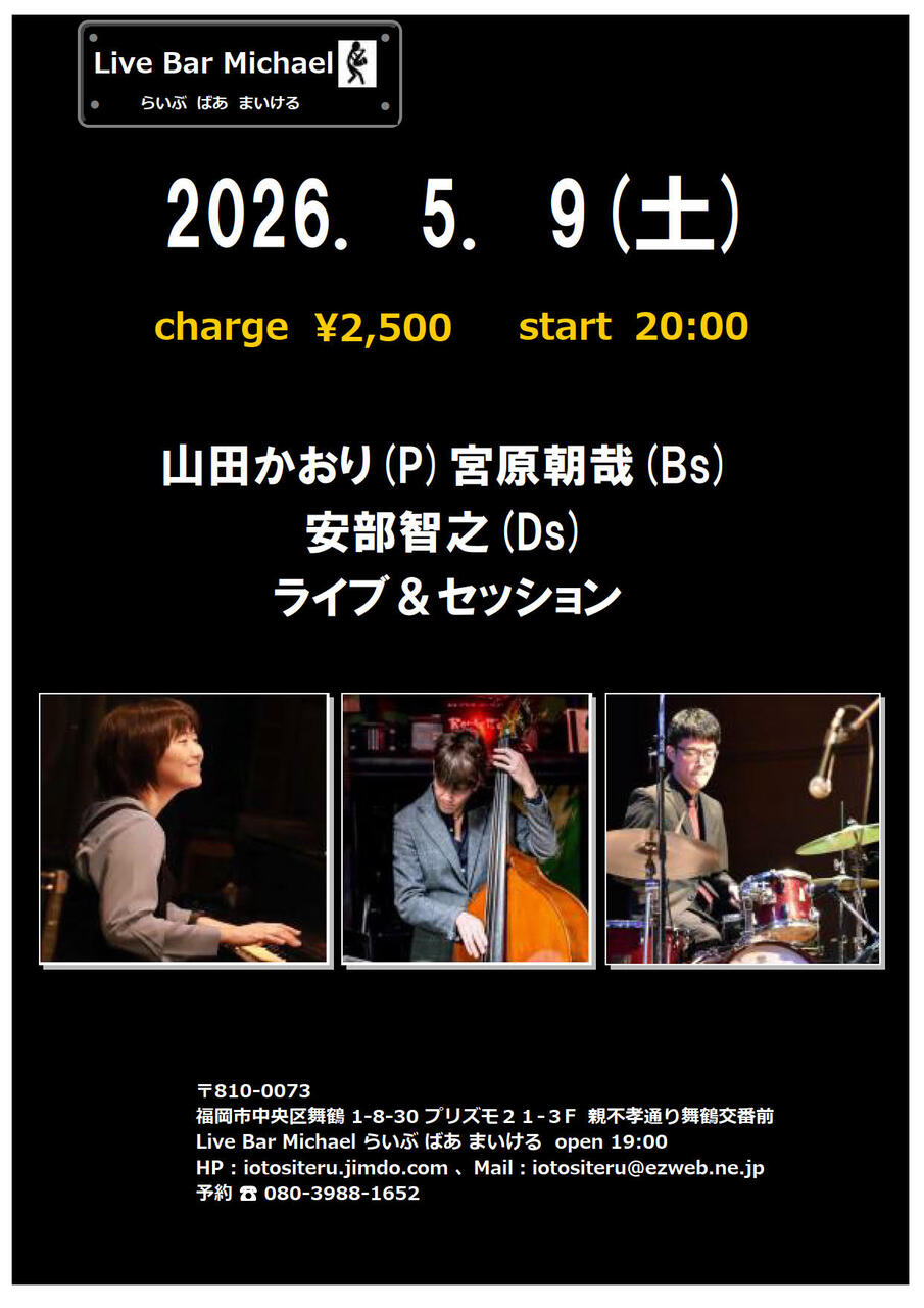 - 出 演 : 山田かおり(P)宮原朝哉(Bs)安部智之(Ds)ライブ&セッション2500円20:00スタート