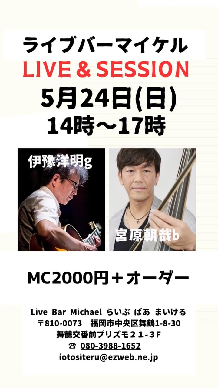 - 出 演 : 日曜マイケル昼2-5セッション伊豫洋明(Gt)宮原朝哉(Bs)2000円14:00~17:00